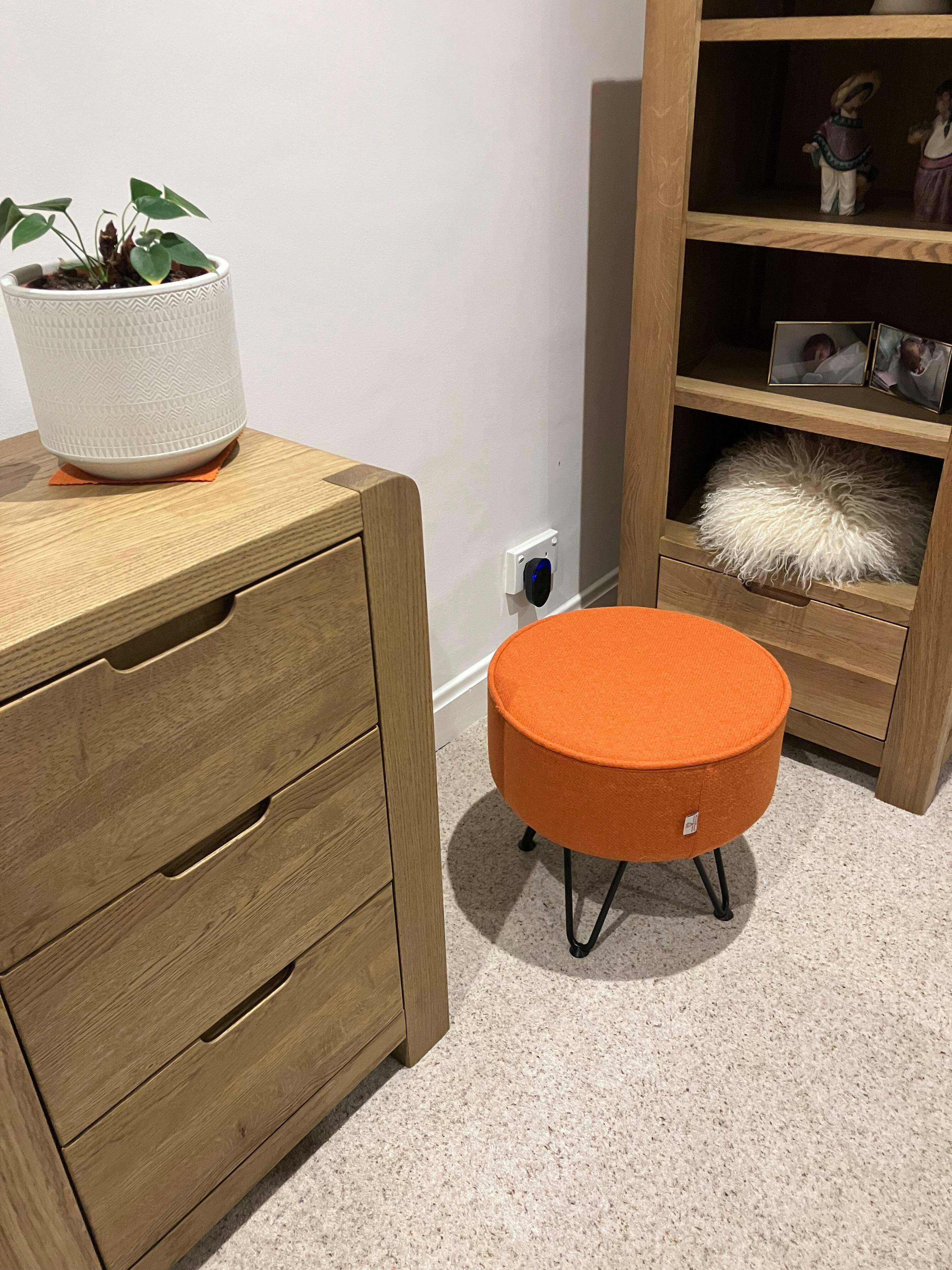 This footstool features a solid clementine colour with matching piping detail. The footstool proudly exhibits the Harris Tweed label, adorned with the iconic Orb symbol that is globally recognised as the hallmark of Harris Tweed authenticity.