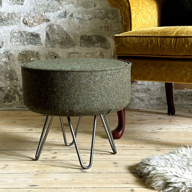 Embrace the sophistication of Harris Tweed with our Moss footstool, standing at approximately 37cm/15” tall with a diameter of 42cm/16.5”.