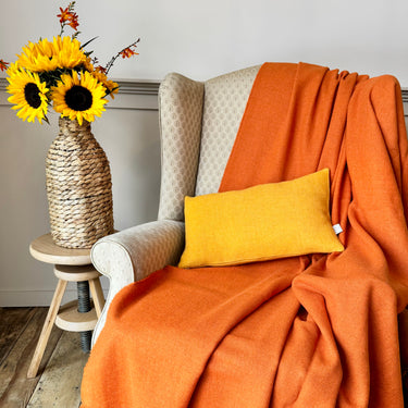 This pure wool cushion features a solid mustard yellow colour on both the front and back and a coordinating concealed zip along the bottom seam. The cushion proudly exhibits the Harris Tweed authenticity label, adorned with the iconic Orb symbol that is globally recognised as the hallmark of Harris Tweed authenticity.
